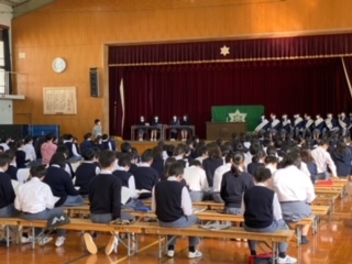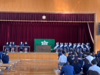 体育館にて生徒会役員選挙の演説会が行われました。立候補者が公約をしっかりと生徒の皆さんに伝えていました。