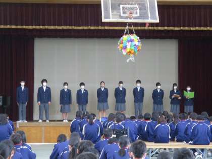 今日の6時間目、新入生歓迎会を3学年一緒に体育館で行いました。生徒会からのオリエンテーション、2・3年生からの合同出し物「西院ジャンボリミッキー」、プレゼントの贈呈、新入生からの代表あいさつ、くす玉割りと盛りだくさんの内容でした。これで、1年生も西院中学校の仲間入りです。これえから一緒によりよい西院中学校を作っていきましょう。