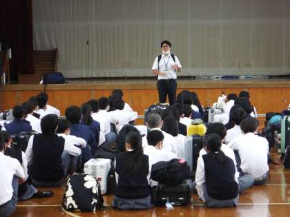 結団式の様子です。校長先生の話、修学旅行実行委員長の話、添乗員さん・カメラマンさんの紹介、学年主任の先生からの諸注意などがありました。