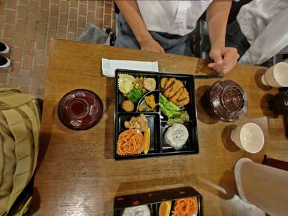 お弁当を食べています。みんなで食べる食事のラスト。いただきます。