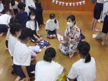 本日、1組と1年生で和装教室を実施します。外部から5名の講師の方に来ていただき、浴衣の着付けを学びました。慣れない着付けに戸惑いながら、生徒たちは頑張っていました。