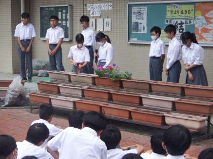 昨日と本日、グリーン活動の引き継ぎ会が行われました。昨年度、今の3年生が一生懸命取り組んでいたことを、今年度は2年生が引き継ぎます。3年生から丁寧な説明があった後、一緒に花抜き等を行いました。3年生の伝統を2年生はしっかりと引き継ぎましょう。