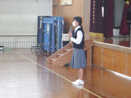 本日、2学期始業式を体育館で行いました。伝達表彰の後、校長先生のお話、西村先生のお話、生徒会長のお話等がありました。生徒の皆さんが、元気に登校してきてくれたのが、とても良かったです。2学期は、体育大会、合唱コンクールをはじめ、たくさんの行事があります。みんなで協力して、良い行事にしていきましょう。