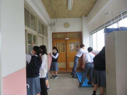 普段の掃除では、なかなか行き届かない階段や校舎の壁を中心に清掃しました。学校施設をきれいに大切に使用することで、気持ちよく学校生活が送れると思います。日頃から、丁寧に清掃活動はできていますが、今回の取組を通して、さらに美化意識の向上をしてもらえるとうれしいです。
