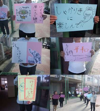 朝早くから教職員の方も見送りに来てくれました。ありがとうございます。それぞれの方が、画用紙にメッセージを書いてくれていました。