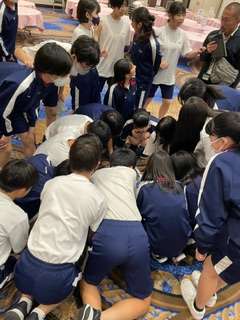 1日目、夜レクの様子です。レク担当の生徒が3年の先生方にふんして、盛り上げてくれました。先生方の小さい頃の写真あてクイズ、人間知恵の輪、風船リレーなどをして盛り上がりました。クラスで、学年で楽しめました。