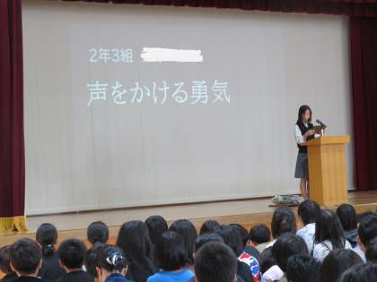 本日、2、3限に人権作文全校発表会を体育館で行いました。夏休みの課題として行った人権に関する作文をクラス、学年で発表し、学年代表を決め、本日各学年の代表生徒が発表してくれました。学年代表の発表を聞いて、それぞれが人権について考える時間になったのではないでしょうか。発表してくれた皆さん、ありがとうございました。