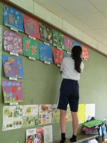教室では、掲示物の手伝いや、授業に困っている