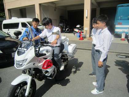 白バイの説明を聞いたり、実際に乗せてもらったり、警察の裏側を見せてもらいました。