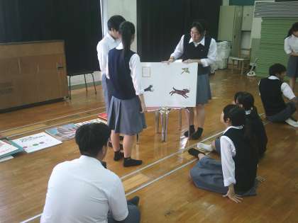 大きな本のページのめくり方や仕掛け絵本の見せ方など、普段自分で読むときには意識しないことも、他人に読み聞かせるときには大事な点もたくさん教わりました。最後に班ごとに読み聞かせの発表を行いましたが、どの班もコツをつかみながら話せていました。当日も頑張って下さい。