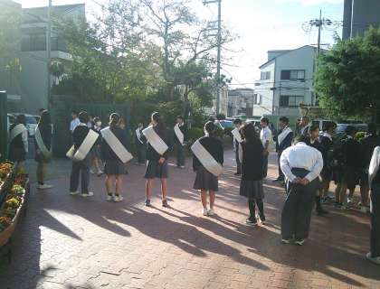 立候補者が校門で大きな声で挨拶とともに選挙運動をしていました。