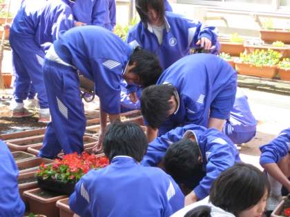 本校CGH活動における「2年生グリーン活動」の様子です。校門付近には,美しい花々が咲き誇っています。