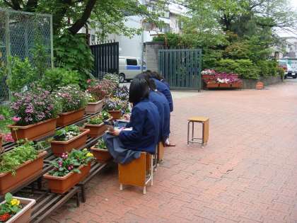 1年生は美術の授業で,中庭のプランターの花々をスケッチしています。
