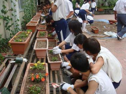できあがった土をプランターに入れ,苗を植える。