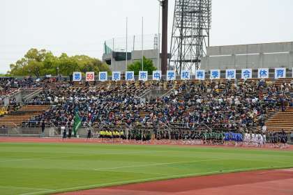 さぁ、いよいよ西院中学校の入場行進です。しっかりと腕も振れ、大きなかけ声もしっかりとスタンドまで届いていました。行進中の演奏には、西院中の吹奏楽部も参加。自分たちの演奏にあわせてバックストレートを歩く、西院中の生徒の姿はどんな感じたったでしょうか。