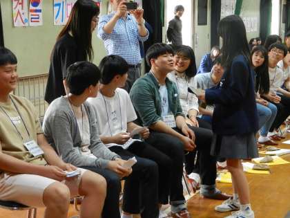 体育館での歓迎セレモニーの最後に、インタビューそして拍手の中、次の交流会の会場にむかいました。