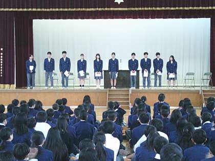 次に、生徒会本部役員の認証を行いました。一人一人に校長先生から認証書が手渡されました。そして意気込みを述べ、新たな生徒会の一歩が始まりました。