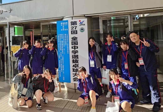 明日より2日間、女子卓球部は、全国大会に出場します。本日は、前日練習で、実際の会場を使って練習をしました。明日の大会に向けて、準備万端です。明日は、一戦必勝で頑張ってください。また、今回の大会に向けて、PTAや地域の方からいろいろとご協力をしていただいております。ありがとうございました。