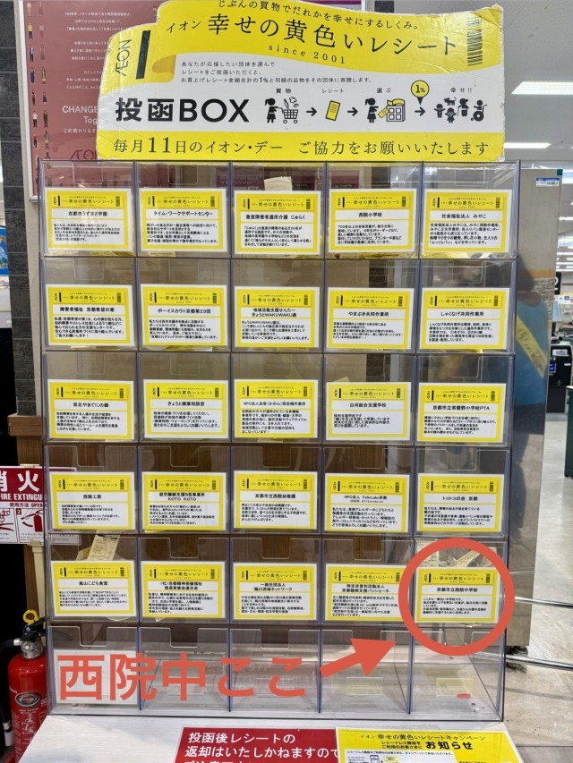 皆さまからお寄せいただいた黄色いレシートの1%は、西院中学校PTAの活動費として大切に活用させていただきます。