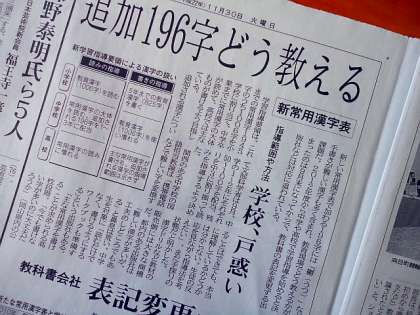 現行の学習指導要領では、「中学卒業までに常用漢字の大体が読めるように、高校では主な常用漢字が書けるように」と規定していますが、文部科学省では9月、「追加された196字を中学校の1〜2年にそれぞれ50〜100字を配当、残りを中3に割り振って読みを指導する」ように決めました。今後の流れとしては、2011年度は必要に応じて中学校・高校で指導が可能になり、2012年度に正式指導開始、2015年度の入学対象者の高校・大学入試から「新常用漢字」からの出題が解禁されます。