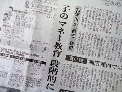 「正月に多くの子どもたちが楽しみにしているお年玉。子どもに自由に使わせるにせよ、親が預かって管理するにせよ、お年玉はお金のありがたみや管理方法を子どもに教える格好の材料だ。」として、年齢に応じた金銭教育の方法や注意点などを専門家の話をもとにまとめてありました。