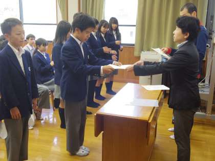 5/10(木)6限 前期生徒会委員の認証式が行われました。各委員会を代表して、今回は2年生1組、2組のみんなが代表で校長先生より認証状をいただきました。