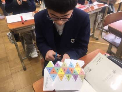 1/17(金)1限 1年生の数学の授業の様子です。単元は多面体。今日は正20面体モデルを実際に組み立てました。