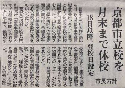 それを受けて「京都市の門川大作市長は4日,政府の緊急事態宣言延長を受け,今月17日までとしていた市立学校の休校期間を5月31日まで延ばす方針を示した。」(京都新聞デジタル版 5月4日 18:23)と報道されました。