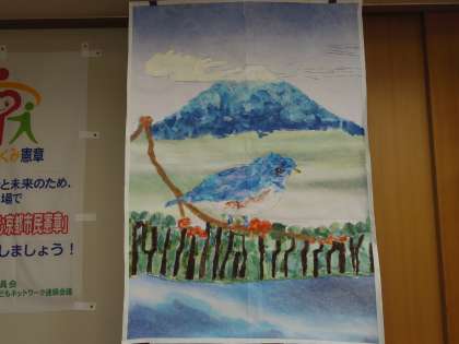 10/2 1限は展示鑑賞です。1ねん1,2組のみんなが制作した和紙のちぎり絵「富士山の鳥」です。