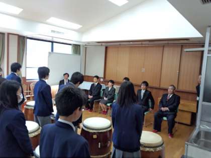 4月8日7名の教職員をお迎えし,着任式を行いました。着任された教職員の方々からは,緑の多い自然に囲まれた中で,みなさんと一緒に頑張っていきましょうと挨拶をされました。その後,恒例になっている和太鼓部の歓迎演奏を行い,至近距離での和太鼓演奏に驚かれているようでした。