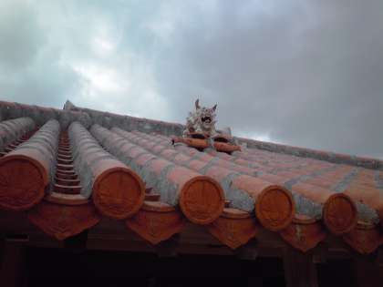 生徒たちは午前中、各民家さんと活動中です。少し雲が出てきました。ハイビスカスがあちこちで咲いています。読谷村の屋根の上にもシーサーが魔除けに飾ってあります。