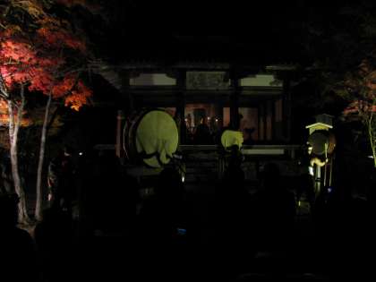 21日(金)夕方5時30分より和太鼓部が,ライトアップされた幻想的な神護寺の境内で演奏を行いました。ライトアップに来られた一般のお客さんも多数おられる中で,もみじ・課題・汽車・雷の4曲を演奏しました。昨年よりも寒さがましだとは言いながら,夕暮れで気温がどんどん下がってくる中,法被姿の中学生は少し寒そうでしたが,息の合ったバチさばきを見せてくれました。アンコールがあり,課題の曲を再度演奏して,拍手を浴びていました。