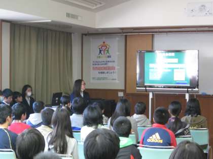 続いて,生徒会 書記より生徒会組織についての説明,保健委員長よりフレンドリー活動についての説明,会計より生徒会行事の説明の様子です。
