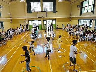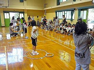 今回のスポーツフェスティバルは、新聞紙で作った十本の輪をチームメンバーの受け手となった人に投げて、腕に入れば1点、足で受け止めたら5点というように難易度によって点数を変えて、チーム全員の合計得点を競いました。この輪投げゲームに参加してくれた多くの小学生を中心に、保護者の方々、教職員が楽しいひとときを過ごし、交流を深めることができました。ご参加並びにご協力いただいた皆様方に厚くお礼申し上げます。