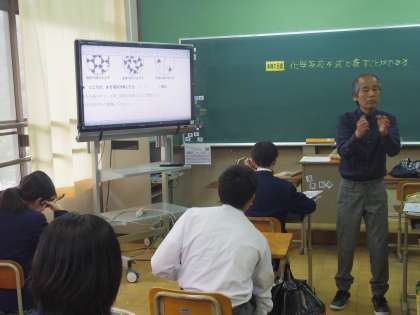 2年生の理科は化学反応式。先日行った水が水素と酸素に電気分解される実験を、原子・分子のモデルを使ってそのしくみを考えました。授業に前向きに取り組むみんなの姿が印象的でした。また、授業の冒頭で取り上げた化学反応式をモチーフにしたラップの動画は大いに盛り上がりました。