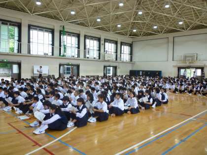 5限に体育館で生徒総会が実施されました。生徒会長あいさつ、28年度決算報告、29年度予算案提示、各委員会の委員長から活動方針・活動予定が発表されました。いくつかのクラスから質問がありましたが、各委員長が返答を行い、概ね原案通り承認されました。