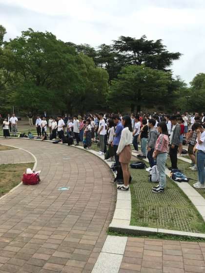 爆心地公園で平和セレモニーを行いました。代表生徒が、平和宣言を読み上げた後、折り鶴を奉納し、全員で黙祷しました。厳粛な雰囲気での平和セレモニーでした。