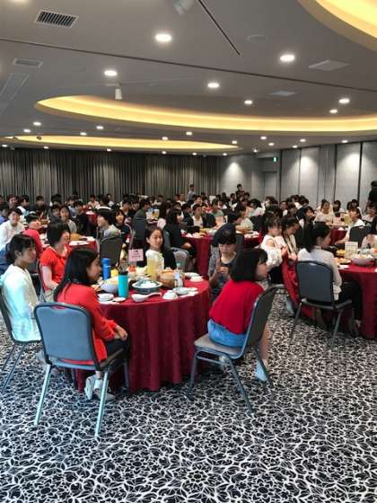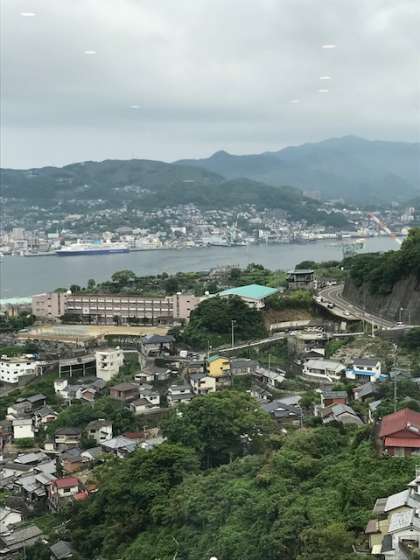 眺めが素晴らしいレストランで食事が始まりました。メニューは、長崎名物の卓袱料理です。班別研修でお腹が空いたと思いますので、たくさん食べてください。