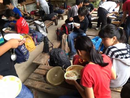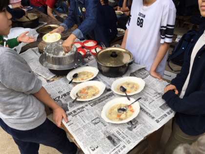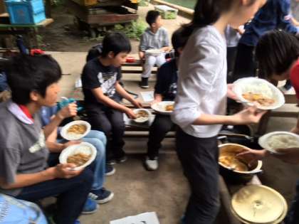出来上がりました。クリームシチューと豚汁とカレーです。いただきます。