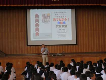 講師の方が、事前に双ヶ丘中学校区での自転車事故の発生場所を調べ、写真などで紹介されました。自分たちの知っている場所を見て事故が身近に起こっていることを再確認しました。また、京都市の他の地域でも起こっている事故を示し、事故の共通点などを考えさせるように講義を進めていただきました。