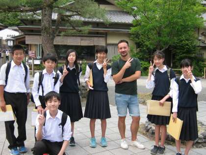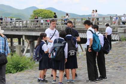 インタビューの様子と外国人観光客との記念撮影