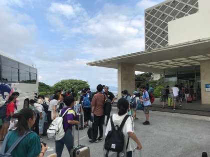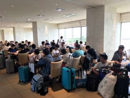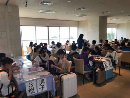 美ら海水族館を出発して、ホテルに到着しました。部屋長会議を行っています。
