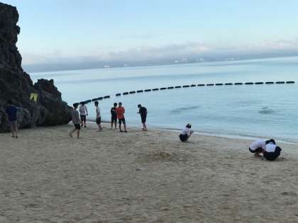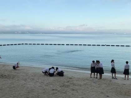 いよいよ最終日の朝になりました。天気は、晴れ。今日も暑くなりそうです。早起きした生徒がビーチを散策しています。今日の予定は、ホテルを出発して、国際通りで、班別研修を行います。