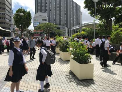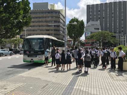 予定時間通りに国際通りに到着しました。これから班別研修です。集合時間は、12:20です。
