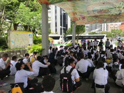 県庁前に集合が完了しました(12:35)。この後、那覇空港に向かいます。