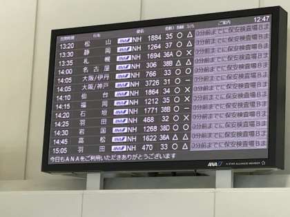 那覇空港に到着しました。14:05発のANA766便です。伊丹空港着は、16:00の予定です。