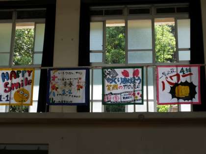 中学校に入学して初めての生徒総会。ステージの上で堂々と話す先輩の姿が目に焼きついたと思います。いずれ現在の1年生の番がまわってきます。さて、会場の体育館の手すりには、素敵な学級旗が飾られました!