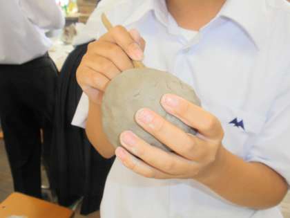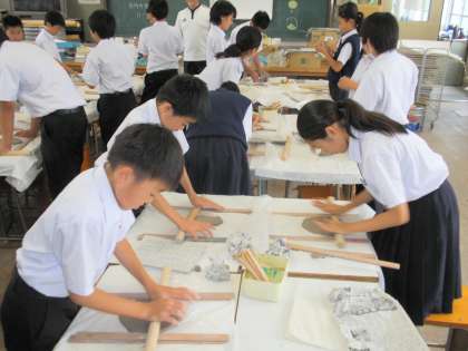 美術の時間、生徒たちは土鈴つくりに取り組んでいます。新聞紙を丸めたものを、広げた粘土で包んでいます。さらにヘラで切れ込みをいれています。焼き上がりはどのようになるのか、楽しみですね。