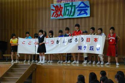 27日(水)4限に,春季総合体育大会に出場する各部選手たちを全体で激励し,健闘を祈ることを目的に「春季総合体育大会激励会」が生徒会主催で実施されました。吹奏楽部のファンファーレから始まり,開会宣言,選手入場,生徒会長の激励のことばと続き,各部から決意表明を発表しました。決意表明の時,1年生から響めきがおこったほどすばらしい各部の決意表明でした。各部の健闘を期待しています。