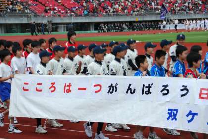 29日(金)晴天の中,西京極総合運動公園にて春季総合体育大会開会式が催されました。本校からも100名以上の生徒たちが参加し,素晴らしい行進をしてくれました。横断幕「こころはひとつ,がんばろう日本 双ヶ丘中」を掲げ,それは立派な行進でした。行進の姿を見て確信しました。双ヶ丘中学校の生徒たちを私たちは誇りに思います。
